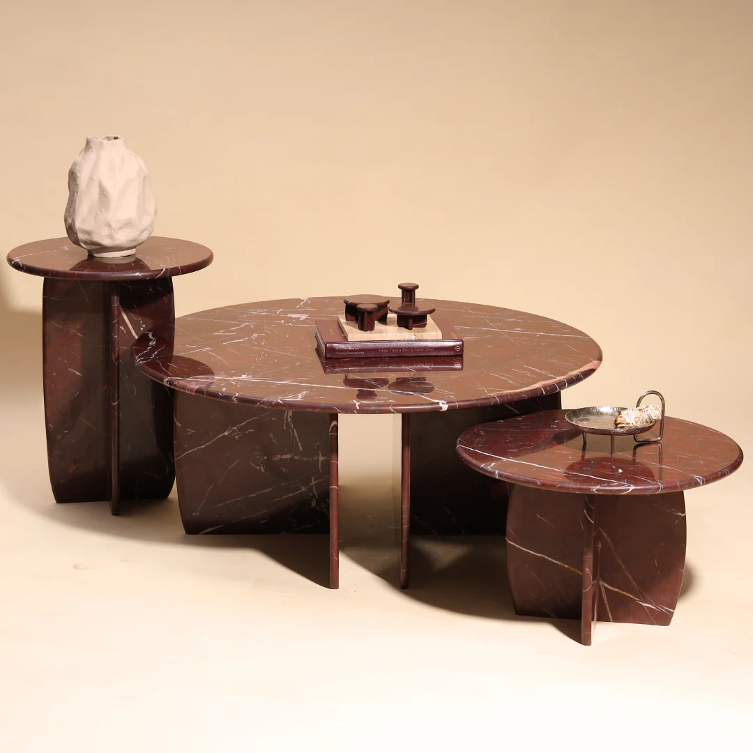 - Introducing the Raio Coffee Table -Rosso : Our newly designed marble tables feature gentle curves on the tabletop and arched legs, creating an warm, cozy and inviting aesthetic.