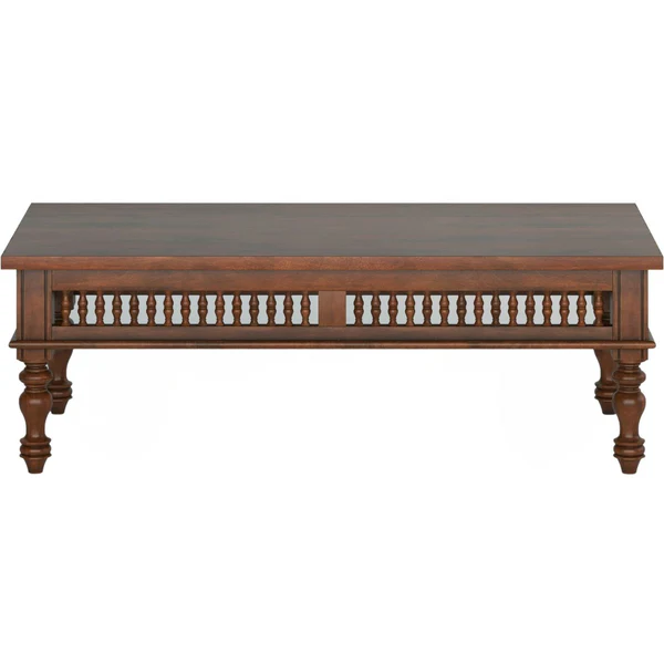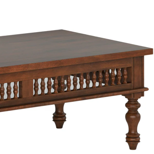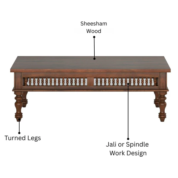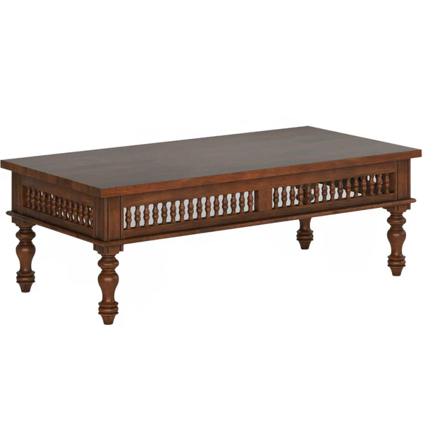 🪑Design & Aesthetic This coffee table features a stately rectangular top with intricately turned legs and elegant spindle detailing along the sides, blending classic Indian craftsmanship with sophisticated style. The rich brown finish and refined proportions give it a luxurious yet inviting appearance, ideal for both formal and casual settings.